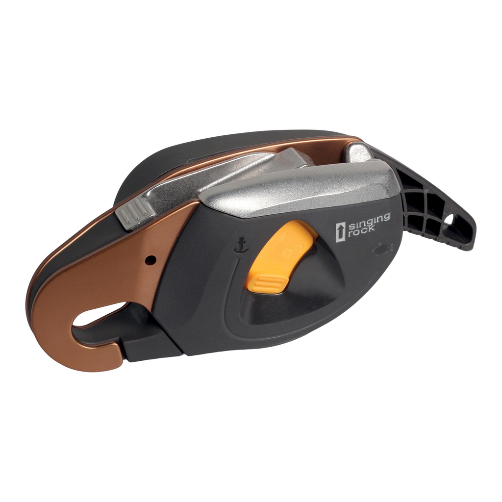 - with an unloaded rope, the locking mechanism can be deactivated by pressing the cam and thus the rope can be pulled out of the device without using the lever - this allows the device to be used, for example, for belaying a lead climber or for quick movement on a flat roof